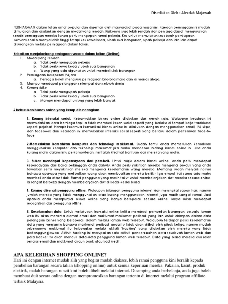 Karangan Perniagaan Dalam Talian / Perdagangan secara talian kini merupakan satu mekanisme baru dalam urus niaga.. Idea asas di sebalik perniagaan dropship adalah bahawa, sebagai pemilik perniagaan kecil, anda tidak perlu menyimpan atau menyimpan barang dan tidak perlu menangani barang penghantaran kepada pelanggan anda. Perniagaan dalam talian turut memberikan peluang kepada peniaga dalam talian beroperasi selama 24 jam setiap hari. Sebuah perniagaan dalam talian mendapati akaun facebook mereka digodam, menyebabkan mereka kehilangan kesemua 80,000 pengikut yang telah dikumpul selama beberapa. See more of peluang perniagaan dalam talian on facebook. Sambutan hangat daripada masyarakat dalam era globalisasi ini.